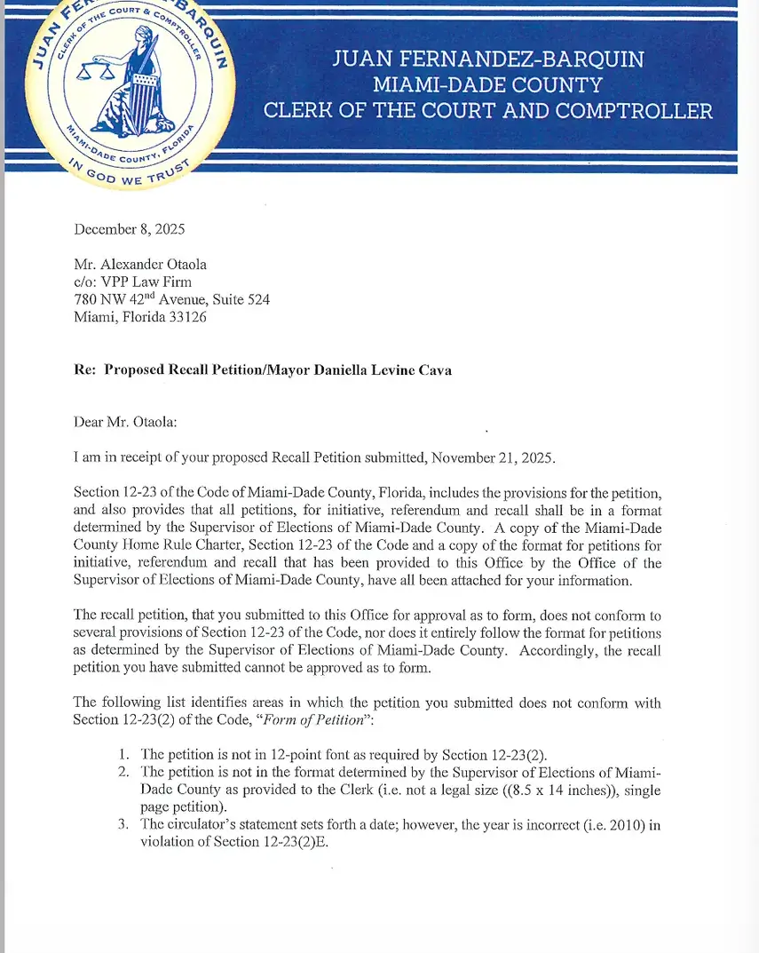También sostuvo que la alcaldesa Levine Cava “permanece como la líder electa más popular del sur de Florida” y que los votantes percibirán el revocatorio como una maniobra sin base.