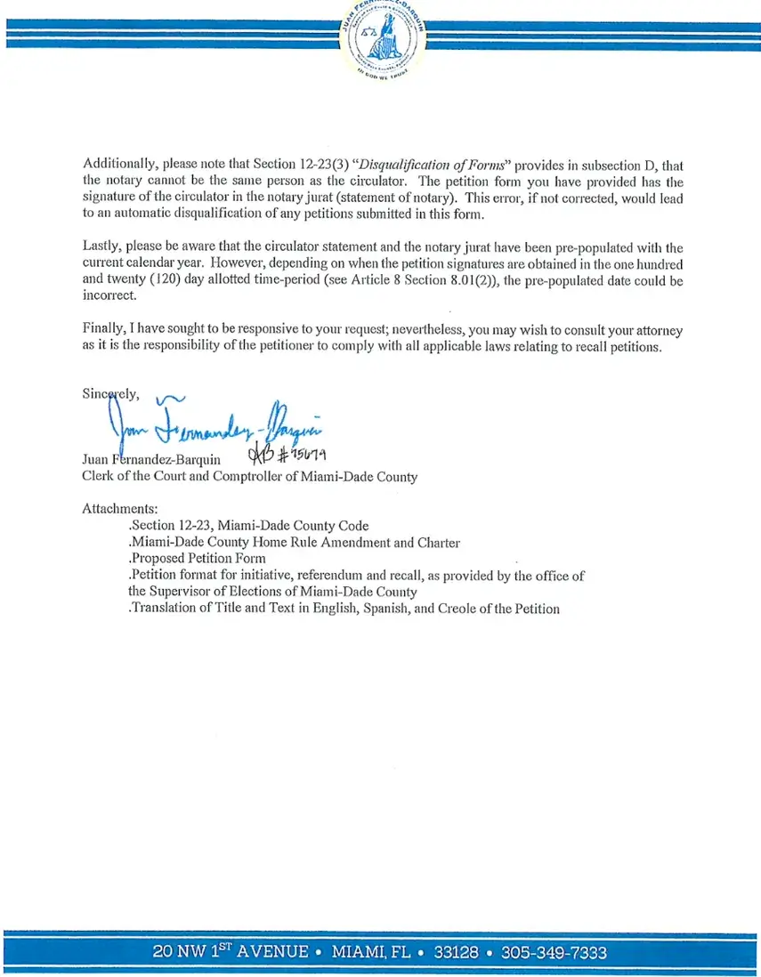 Operativamente la carta de Barquín significa que Otaola debe corregir los errores señalados y entregar nuevamente la petición para que el Clerk pueda aprobarla, como paso previo a la recolección de firmas.