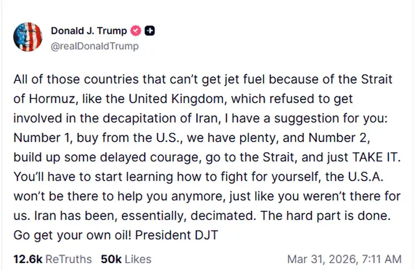 En un mensaje en redes sociales, el mandatario estadounidense apunta al Reino Unido y otros países que «no pueden conseguir combustible para aviones debido a (la crisis) en el estrecho de Ormuz», tras recordarle a Londres que se «negó a participar en la ‘decapitación’ de Irán».