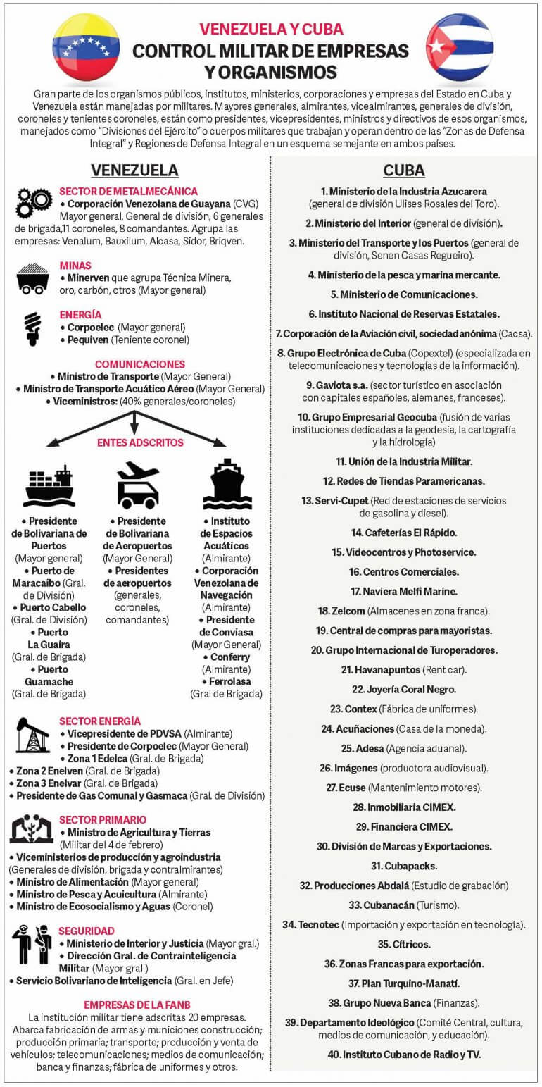 Al igual que en Cuba, los altos oficiales están en una suerte de “Divisiones Industriales” en metalmecánica, en minería, en energía, en finanzas, alimentos, entre otras. Adicionalmente, ocupan 32% del gabinete ejecutivo y 30% de las gobernaciones de estado.