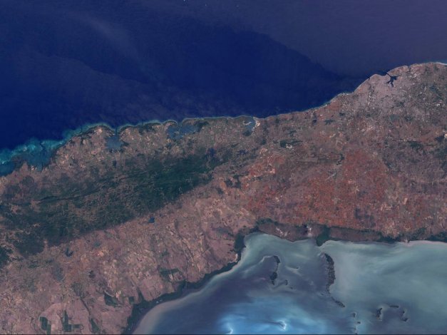En esta imagen del satélite Landsat 7 se ven las costas de la región occidental de la isla. Al sur, las aguas poco profundas y transparentes del Golfo de Batabanó, permiten ver los fondos arenosos, mientras que la costa norte es visiblemente profunda. En la imagen es fácil distinguir los puertos de Mariel y La Habana