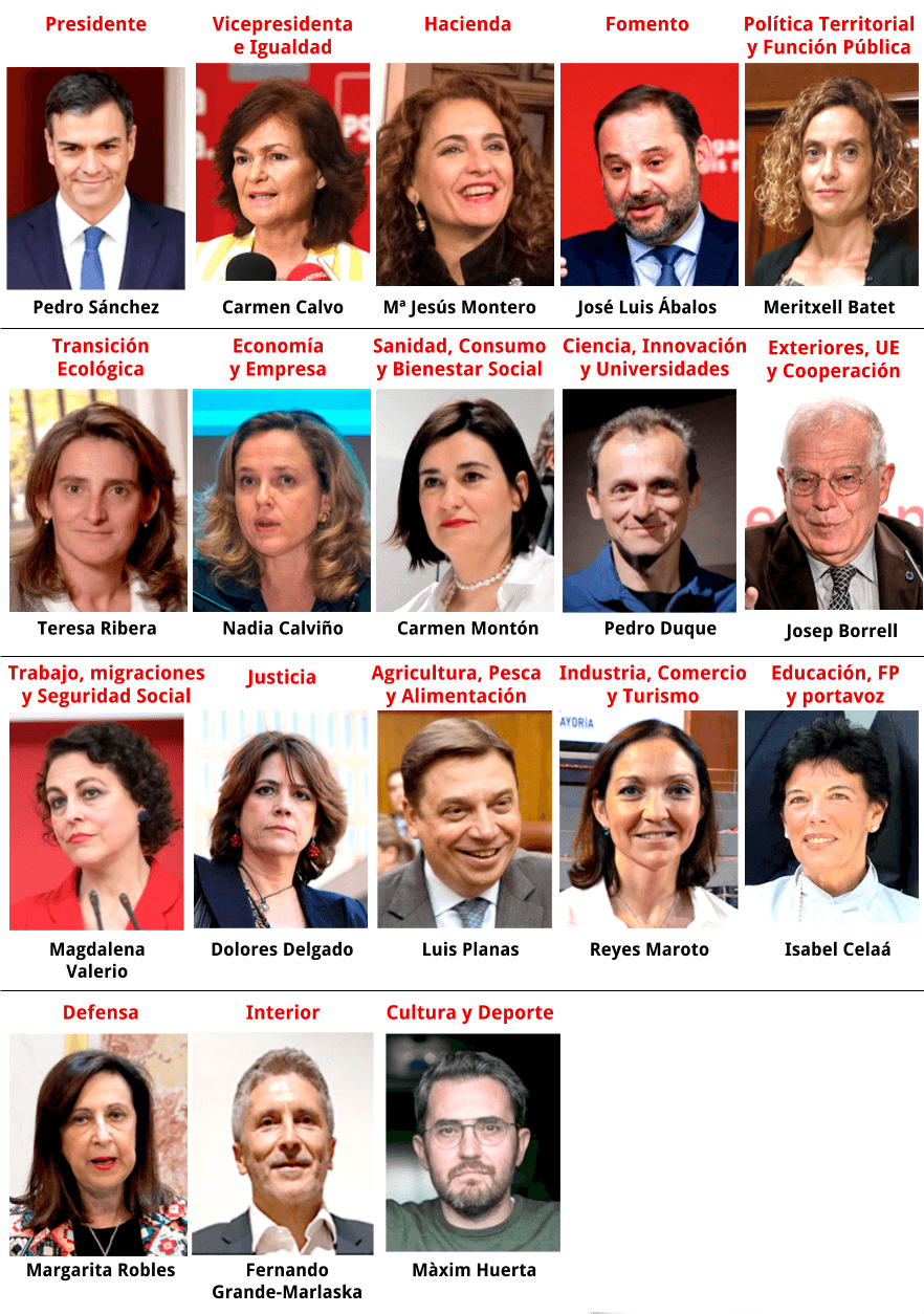 Pedro Sánchez ya ha elegido Gobierno, un gabinete con marcado carácter femenino. Los ministros de su gabinete han prometido sus cargos este jueves ante el rey Felipe VI en el Palacio de la Zarzuela.