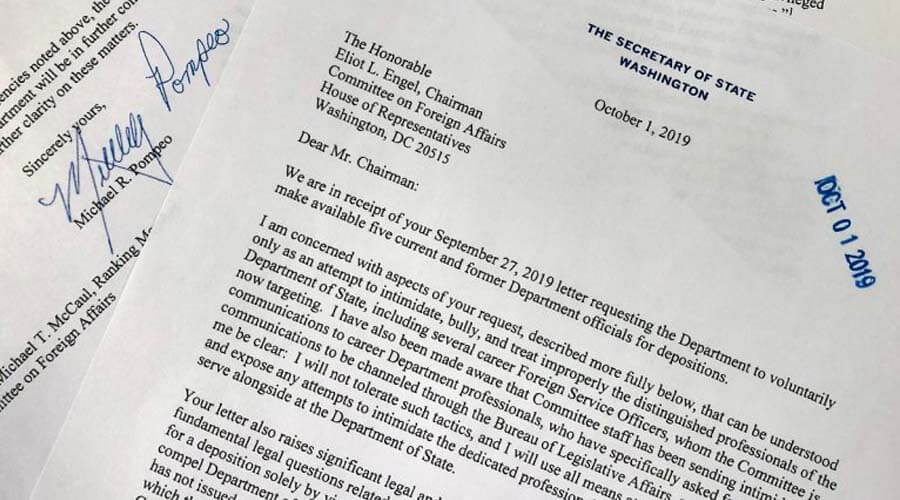 Pompeo señaló que los demócratas intentaban “intimidar” y “abusar” de funcionarios de carrera para que comparecieran y declaró que podría “no ser posible” de la manera en que lo exigen. Los investigadores de la Cámara baja respondieron que sería ilegal que el secretario intentara proteger a Trump al evitar que los funcionarios rindieran testimonio ante el Congreso.