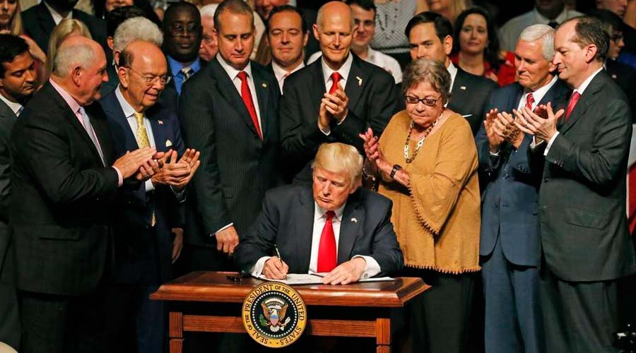 Rodeado de los arquitectos de la política, el senador Marco Rubio y el representante Mario Díaz-Balart, así como del vicepresidente Mike Pence y el representante Carlos Curbelo, Trump firmó el memorando presidencial que prohíbe las transacciones financieras con las empresas cubanas controladas por los militares, entre ellas las pertenecientes al Grupo de Administración Empresarial S.A., GAESA.
